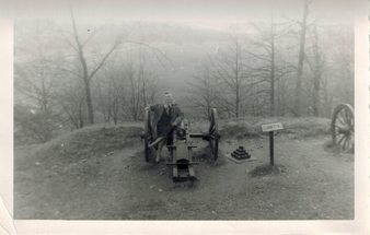 Collection: Alison Laing's Photographs Institution: Joseph A. Labadie Collection, University of Michigan Creator: Date: Nov. 1956 Topics: Crossdressers, Ordnance, Recreation areas Subject: Alison Laing, Lunette Description: Alison Laing poses for a photo, sitting on a cannon at what could be a historical site. A sign next to the cannon reads LUNETTE