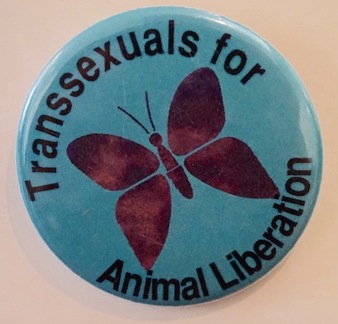 Collection: Button Collection Institution: The ArQuives Creator: MacKay, Xanthra Phillippa, Genderpress, Ross, Mirha-Soleil Date: circa 1990 Topics: Animals, Transsexual people Description: Round button with black text on blue background with large purple butterfly in centre. The button reads "Transsexuals for Animal Liberation". -