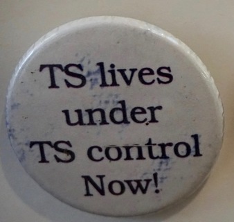 Collection: Button Collection Institution: The ArQuives Creator: MacKay, Xanthra Phillippa, Genderpress, Ross, Mirha-Soleil Date: circa 1990 Topics: Transgender people, Transsexual people Description: Round button with black text on white and blue textured background. The button reads "TS lives under TS control Now!". -