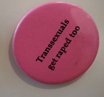 Collection: Button Collection Institution: The ArQuives Creator: MacKay, Xanthra Phillippa, Genderpress, Ross, Mirha-Soleil Date: circa 1990 Topics: Sexual assault, Transgender publishers, Transsexual people Description: Round button with black text on pink background. The button reads "Transsexuals get raped too". -