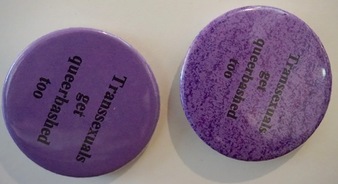 Collection: Button Collection Institution: The ArQuives Creator: MacKay, Xanthra Phillippa, Genderpress, Ross, Mirha-Soleil Date: circa 1990 Topics: Hate crimes, Transgender publishers, Transsexual people Description: Two round buttons with black text on purple background, one mottled purple. The button reads "Transsexuals get queerbashed too". -