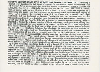 Collection: Court and Legal Documents Institution: The Lesbian, Gay, Bisexual & Transgender Community Center Creator: Lesbian/Gay Law Notes Date: Oct. 1984 Topics: Anti-discrimination law, Anti-gay discrimination, Anti-lesbian discrimination, Homosexuality, Lesbians, LGBTQ+ discrimination, Transsexual people Subject: Christian Science Monitor, Christine Madsen, John Nehrich, Ken Ulane Description: An excerpt from Lesbian/Gay Law Notes that details a case of anti-LGBTQ+ discrimination as it relates to Title VII. The case in question, Ulane vs. Eastern Air Lines, Inc., involves a transsexual i...
