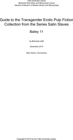 Collection: Discovery Resources Institution: Yale University Libraries Creator: Yale University Library Beinecke Rare Book and Manuscript Library Date: Dec. 2014 Topics: BDSM, Crossdressers, Erotica, Transgender people Subject: Laura Bailey, Satin Slaves Description: Erotic pulp fiction related to male cross-dressing. Individual titles (see accompanying list) taken from cover. All individual titles paperbound. -