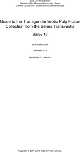 Collection: Discovery Resources Institution: Yale University Libraries Creator: Yale University Library Beinecke Rare Book and Manuscript Library Date: Dec. 2014 Topics: BDSM, Bisexuals, Crossdressers, Erotica, Transgender people Subject: Laura Bailey Description: Erotic pulp fiction related to male cross-dressing. Some individual titles (see accompanying list) taken from cover. All individual titles paperbound. -