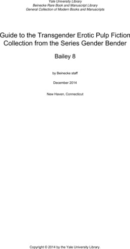 Collection: Discovery Resources Institution: Yale University Libraries Creator: Yale University Library Beinecke Rare Book and Manuscript Library Date: Dec. 2014 Topics: Bisexuals, Crossdressing, Erotica, Transgender people Subject: Gender Bender, Laura Bailey Description: Erotic pulp fiction related to male cross-dressing, forced feminization, and other transgender activity. All individual titles paperbound. -