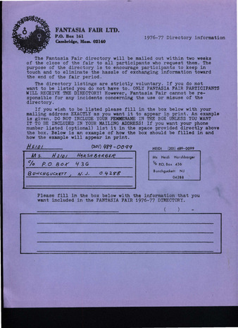 Collection: Fantasia Fair: Miscellaneous Documents Institution: Transgender Archives, University of Victoria Creator: The Outreach Institute Date: circa Oct. 1980 Topics: Crossdressing, Events, Gatherings, Logistics, Paperwork (Office practice)--Management Subject: Ariadne Kane, Eve Goodwin, Fantasia Fair -
