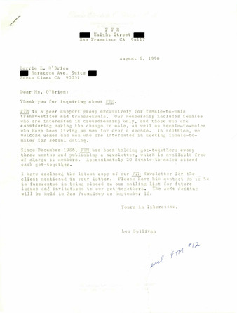Correspondence Between Lou Sullivan and Barrie O'Brien (July-August 1990)