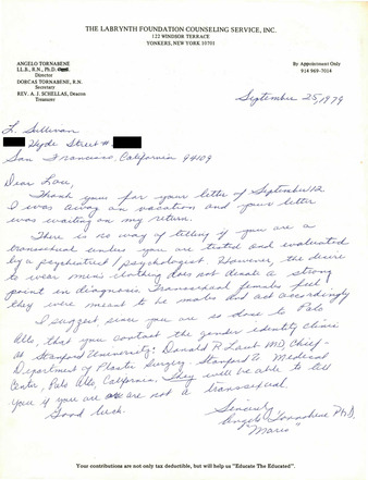 Collection: Lou Sullivan Collection Institution: GLBT Historical Society Creator: Sullivan, Lou, Tornabene, Angelo Date: Sep. 25, 1979 Topics: FtMs, Gender dysphoria, Hormone therapy, Plastic surgery, Psychiatry, Transitioning (Gender), Transsexual people Subject: Donald Laub, Stanford University Gender Dysphoria Program, The Labyrinth Foundation Counseling/Gender Service, Inc. -