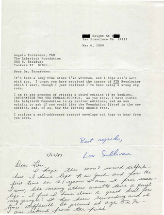 Correspondence Between Angelo Tornabene and Lou Sullivan (May 1989)