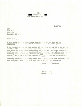 Correspondence from Lou Sullivan to S.G. (January 17, 1989)