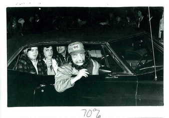 Collection: Miscellaneous Photographs Institution: The ArQuives Creator: Date: circa 1960 to circa 1970 Topics: Anti-transgender violence, Halloween, Homophobia, Riots, Transphobia Description: Four people sit in a car – three are in the backseat and one leans out the window from the front passenger seat – looking at something during the Halloween anti-trans riot. -