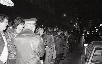 Collection: Miscellaneous Photographs Institution: The ArQuives Creator: Date: circa 1980 Topics: Bars (Drinking establishments), Halloween, Homophobia, Police, Riots, Transphobia Description: A person faces away from the camera while an adjacent police officer engages with them as they stand outside a building with a sign reading, "Charly's," presumably during the annual Halloween riots... -