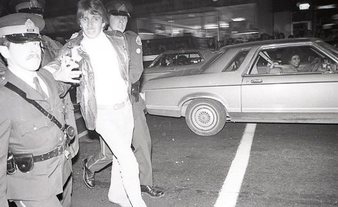 Collection: Miscellaneous Photographs Institution: The ArQuives Creator: Date: circa 1980 Topics: Arrests, Discrimination, Halloween, Homophobia, LGBTI community, Police, Riots, Transphobia Description: A person is escorted down the street by three police officers during the annual Halloween riots in Toronto as someone in a car looks on. -