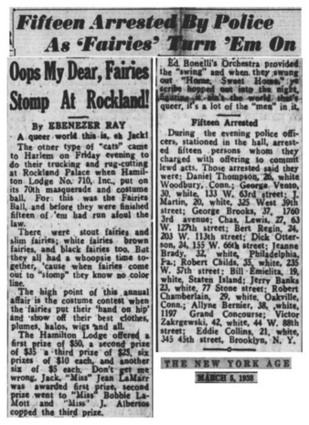Collection: Newspaper and Periodical Clippings (1900-1949) Institution: JD Doyle Archives Creator: Ray, Ebenezer Date: Mar. 5, 1938 Topics: Arrests, Competitions, Crossdressing, Drag, Drag balls, Ethnic relations, Police Subject: Annual Masquerade and Civic Ball of Hamilton Lodge, Hamilton Lodge, The Fairies Ball -