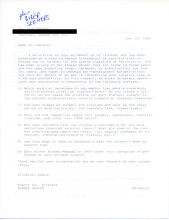 Collection: Rupert Raj Collection Institution: The ArQuives Creator: Raj, Rupert Date: Jan. 27, 1989 Topics: Bottom surgery, Gender affirming surgery, MtFs Subject: Rupert Raj, Yvon Menard Description: Letter from Rupert Raj to Dr. Yvon Menard with questions about surgeries for his wife. Second page includes a form for Confidential Contacts List.