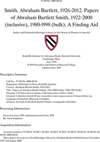 Collection: Discovery Resources Institution: Schlesinger Library, Radcliffe Institute for Advanced Study, Harvard University Creator: Arthur and Elizabeth Schlesinger Library on the History of Women in America Date: Jun. 1999 Topics: Biologists, Gay liberation, Gender identity, Gender realignment surgery, LGBTQ+ parents, Transsexual people Description: Journals of Abraham Bartlett Smith, a transgender individual. -