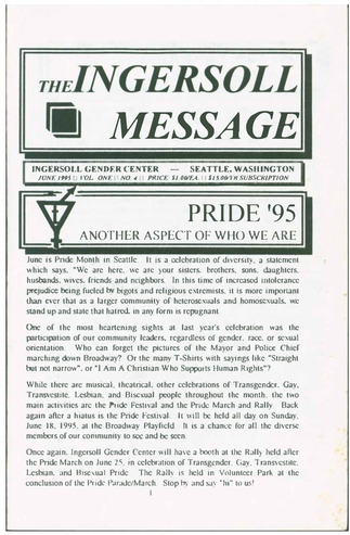 Collection: The Ingersoll Message Institution: Sexual Minorities Archives Creator: Butler, Pat Date: Jul. 1996 Topics: Conferences, FtMs, Gatherings, Gay pride, HIV/AIDS, Prejudices, Support groups Subject: FTM Conference of the Americas, International Foundation for Gender Education (IFGE), Robert Greene Ingersoll, South King County Inaugural Pride Day Family Festival, The Emerald City, Transgender Menace