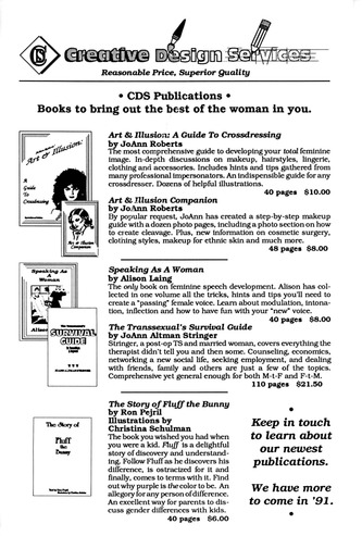 Collection: Creative Design Services Publications and Documents Institution: Transgender Archives, University of Victoria Creator: Creative Design Services Date: 1990? Topics: Crossdressers, Passing (Gender), Social activities clubs, Transfemininity, Transmasculinity Subject: Art & Illusion, Art & Illusion Companion, enFemme Magazine, LadyLike Magazine, Paradise In The Poconos, Speaking As A Woman, The Story of Fluff the Bunny, The Transsexual's Survival Guide -