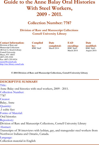 Collection: Discovery Resources Institution: Human Sexuality Collection, Cornell University Creator: Division of Rare and Manuscript Collections, Cornell University Library Date: Mar. 2014 Topics: Blue collar workers, Butch and femme (Lesbian culture), Gays--Alcohol use, Gays--Employment, Homophobia, Iron and steel workers, Masculinity, Transgender people--Employment Subject: Anne Balay Description: Transcripts of 38 interviews with lesbian, gay, and transgender steel workers from Northwest Indiana and Ontario, Canada. Identifying information of the individual steel workers has been deleted, a... -