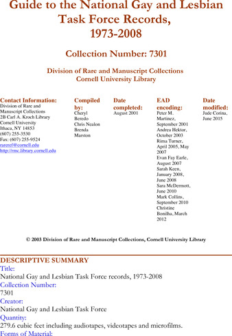 Collection: Discovery Resources Institution: Human Sexuality Collection, Cornell University Creator: Division of Rare and Manuscript Collections, Cornell University Library Date: Aug. 2001 Topics: African American gays, African American lesbians, Bisexuals, Gay liberation movement, Gay men, Gender identity, HIV/AIDS, Homophobia, Homosexuality, Lesbians, Sex discrimination, Sexual orientation, Transsexuals, Violence Subject: Arthur Warner, Bruce Voeller, C.F. Brydon, Gay media task force, Ivy Young, Jeff Levi, Juan Battle, Kevin Berrill, Lucia Valeska, Melinda Paras, Nan Hunger, National Gay and Lesbian Task Force (NGLTF), Peri Jude Radecic, Sue Hyde, United States Commission on Civil Rights, Urvashi Vaid, Virginia Apuzzo Description: The National Gay and Lesbian Task Force (NGLTF) collection consists of correspondence, press clippings, financial and administrative records, subject files, and photographs that, taken together, pr... -