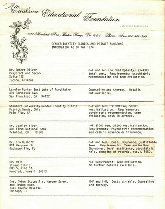 Collection: Informational and Event Brochures Institution: GLBT Historical Society Creator: Erickson Educational Foundation (EEF) Date: May 1974 Topics: Counseling, FtMs, Gender realignment surgery, Hormone therapy, Mental health, MtFs, Transgender people Description: Item originally collected by Lou Sullivan.