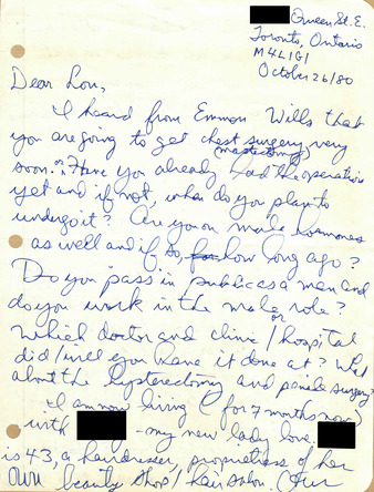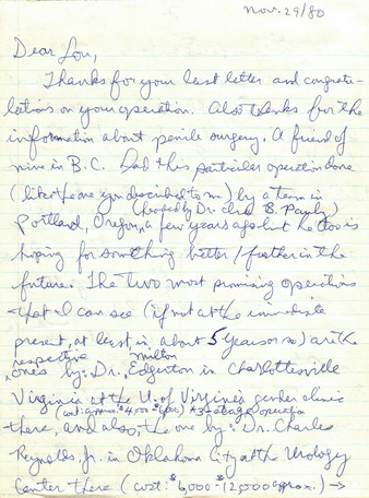 Collection: Lou Sullivan Collection Institution: GLBT Historical Society Creator: Ghosh, Nicholas, Raj, Rupert Date: Nov. 29, 1980 Topics: FtMs, Gender realignment surgery, Phalloplasty, Transitioning (Gender) Subject: Charles Reynolds, Ira B. Pauly, Jude Patton, Milton Edgerton, Paul Walker, The Urology Center, Inc., University of Virginia Gender Clinic -