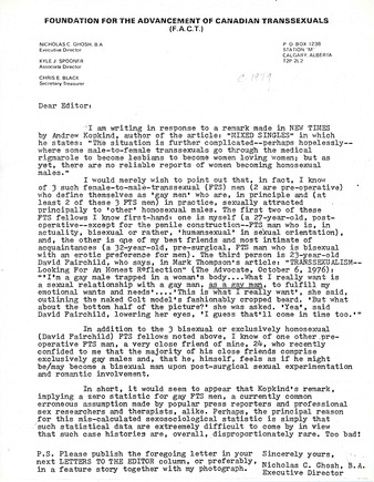 Collection: Rupert Raj Collection Institution: The ArQuives Creator: Ghosh, Nicholas Date: 1979 Topics: FtMs, Gay men, Gender affirming surgery, Transitioning (Gender), Transsexual people Subject: Foundation for the Advancement of Canadian Transsexuals (FACT), Mark Thompson, Rupert Raj Description: Letter to the editor from Nicholas C. Gosh (Rupert Raj) responding to an article published in New Times Magazine. -
