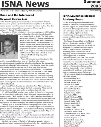 Collection: Hermaphrodites with Attitude Institution: Digital Transgender Archive Creator: Intersex Society of North America (ISNA) Date: Autumn 2002 Topics: Chromosomes, Ethics, Genitals, Intersex, Normalization, Surgery Subject: Bodies Like Ours, Cheryl Chase, Dandara Hill, Garry Warne, Joan Whelan, Julie Dorf, Kimberly Saviano, National Institutes of Child Health and Development, Robert Wood Johnson Medical School, Robin Mathias, Sydney Levy -