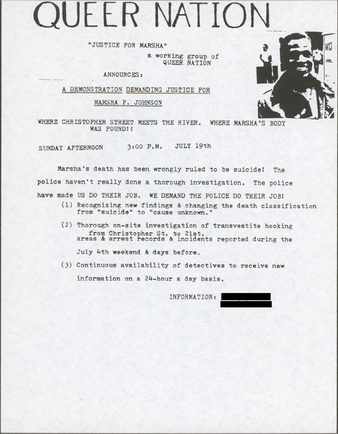 Collection: Marsha P. Johnson & Sylvia Rivera Institution: The Lesbian, Gay, Bisexual & Transgender Community Center Creator: Queer Nation Date: Unknown Topics: Black transgender people, Drag queens, LGBTQ+ death and dying, LGBTQ+ demonstrations, QTPOC, Transfeminine people Subject: Marsha P. Johnson Description: This item is a leaflet created by Queer Nation announcing a demonstration on July 19, 1992 for Marsha P. Johnson to make demands to the police to change the suicide death classification of Marsha's...