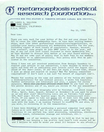 Collection: Lou Sullivan Collection Institution: GLBT Historical Society Creator: Raj, Rupert Date: May 11, 1985 Topics: Cartoons, Colleges, Dildos, FtMs, Gender dysphoria, Gender realignment surgery, Homosexuality, Organisations, Phalloplasty, Transsexual people Subject: Judy Van Maasdam, Metamorphosis Medical Research Foundation, Stanford University Gender Dysphoria Program -