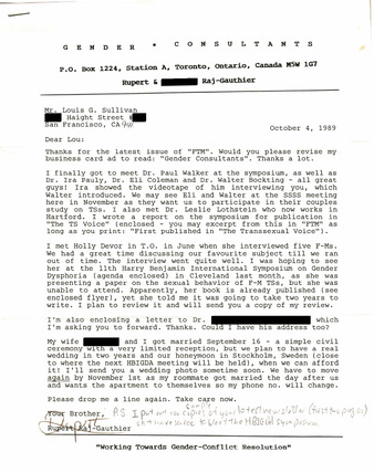 Correspondence from Rupert Raj to Lou Sullivan (October 4, 1989)