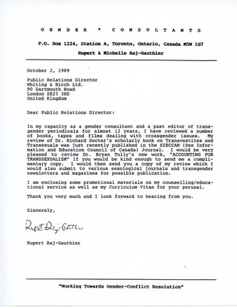 Collection: Rupert Raj Collection Institution: The ArQuives Creator: Raj, Rupert Date: Oct. 2, 1989 Topics: FtMs, South Asian bisexual people, South Asian transgender people, Trans men Subject: Michelle Raj-Gauthier, Rupert Raj Description: Letter from Rupert Raj-Gauthier to a Public Relations Director asking for a copy of Dr. Bryan Tully's new work "Accounting for Transsexualism" for his review. -