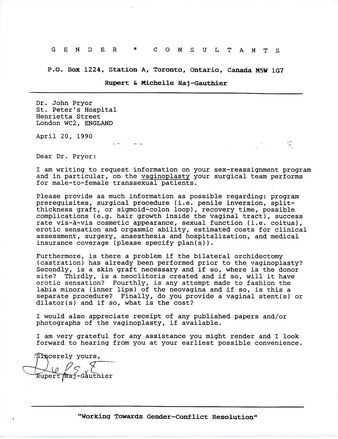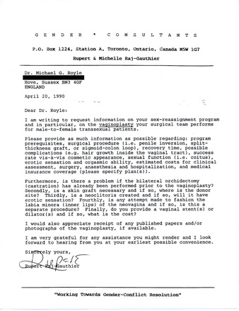 Collection: Rupert Raj Collection Institution: The ArQuives Creator: Raj, Rupert Date: Apr. 20, 1990 Topics: FtMs, Gender affirming surgery, MtFs, South Asian bisexual people, South Asian transgender people, Trans men, Vaginoplasty Subject: Rupert Raj Description: Letter from Rupert Raj to Michael G. Royle requesting information on Royle's gender-affirming surgery program, specifically Royle's vaginoplasty procedure. -