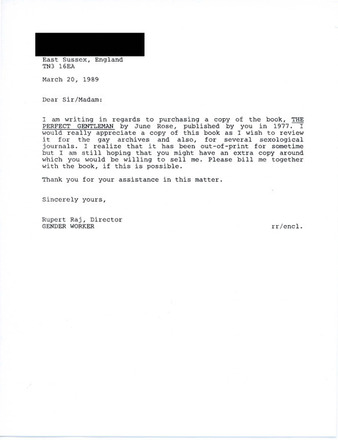 Collection: Rupert Raj Collection Institution: The ArQuives Creator: Raj, Rupert Date: Mar. 20, 1989 Topics: FtMs, South Asian bisexual people, South Asian transgender people, Trans men Subject: Rupert Raj Description: Rupert Raj writes about buying a copy of The Perfect Gentleman by June Rose. He says that it would be very helpful to have for review in gay archives and sexological journals. -