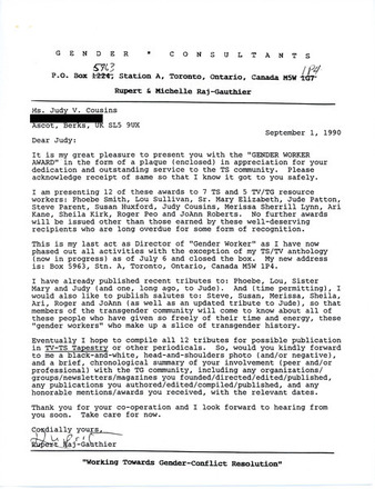 Collection: Rupert Raj Collection Institution: The ArQuives Creator: Raj, Rupert Date: Sep. 1, 1990 Topics: FtMs, South Asian bisexual people, South Asian transgender people, Trans men, Transsexual people Subject: Judy V. Cousins, Rupert Raj Description: Letter from Rupert Raj to Judy V. Cousins presenting Cousins with the "Gender Worker Award" plaque, and requesting a black and white headshot and brief description of the work Cousins' has done so ... -