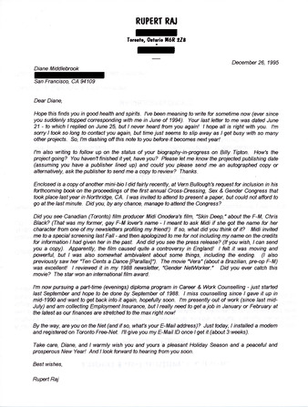 Letter from Rupert Raj to Diane Middlebrook (December 26, 1995)