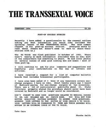 Collection: The Transsexual Voice Institution: Joseph A. Labadie Collection, University of Michigan Creator: Smith, Phoebe Date: Feb. 1993 Topics: Breast cancer, Change of name, Employment discrimination, Femininities, Gender dysphoria, Gender realignment surgery, Hormone therapy, Personals, Psychiatry, Sexual orientation, Sexuality, Transitioning (Gender), Transsexual people -