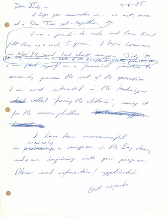 Collection: Lou Sullivan Collection Institution: GLBT Historical Society Creator: Sullivan, Lou Date: Jun. 26, 1985 Topics: Counseling, Crossdressing, Discrimination, FtMs, Gay men, Gender realignment surgery, Hormone therapy, Mastectomy, Sexual orientation, Transitioning (Gender), Transsexual people Subject: Harry Benjamin International Gender Dysphoria Association, Judy Van Maasdam, Paul Walker, Stanford University Gender Dysphoria Program, Steve Dain -