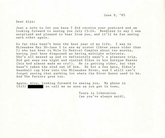 Correspondence from Lou Sullivan to Alyn Hess (June 9, 1985)