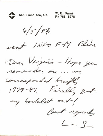 Correspondence from Lou Sullivan to Virginia Prince (June 5, 1986)
