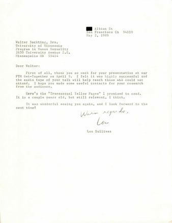 Correspondence from Lou Sullivan to Walter Bockting (May 2, 1989)