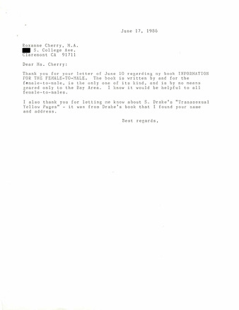 Correspondence from Lou Sullivan to Roxanne Cherry (June 17, 1986)