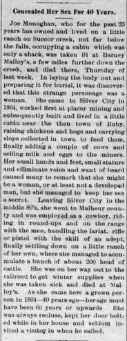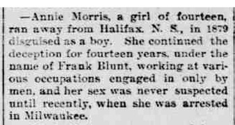 Collection: Newspaper and Periodical Clippings (Pre 1900) Institution: Digital Transgender Archive Creator: The New York Times Date: Oct. 8, 1879 Topics: Appearance, Arrests, Clothing, Health, Hunting, Marriage, Social classes Subject: Female Hunter of Long Eddy, George Slater, Joseph Israel Lobdell, Lucy Ann Lobdell Slater, Marie Louise Perry Wilson -