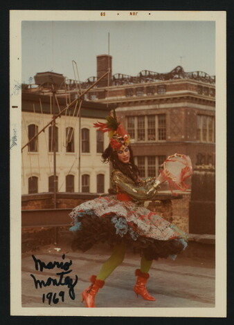 Collection: Miscellaneous Photographs Institution: New York Public Library Creator: Date: Jun. 1969 Topics: BIPOC, Crossdressers, Drag queens, Hispanic LGBTQ+ people, Latino/a/x LGBTQ+ people, LGBTQ+ people of color, QTPOC, Transfeminine people Subject: Mario Montez Description: A photograph of Mario Montez dancing and playing the tambourine on a roof. -