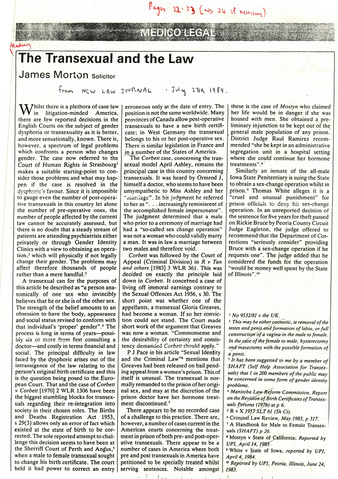 Collection: Newspaper and Periodical Clippings (1950-2000) Institution: Transgender Archives, University of Victoria Creator: Morton, James Date: Jul. 27, 1984 Topics: Anti-discrimination law, Change of name, Child custody, Gender dysphoria, Gender realignment surgery, Law, Marriage, MtFs, Prisons, Transgender parents, Transsexual people Description: Clipping originally collected by Richard Ekins (from The University of Ulster Trans-Gender Archives/Richard Ekins collection at the Transgender Archives, University of Victoria) -