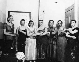 Collection: Miscellaneous Photographs Institution: Los Angeles Public Library Creator: Date: 1920 Topics: Crossdressers, Crossdressing, Parties Description: A uniformed man (center), who appears to be a police officer, poses with three men who are dressed in drag for an event identified as "Joe Harper's Party." The two men on the far right are covering... -