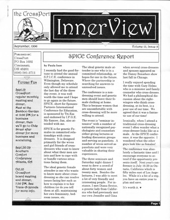 Collection: Cross-Port InnerView Institution: Digital Transgender Archive Creator: Cross-Port Date: Sep. 1996 Topics: Cabaret, Clothing, Crossdressers, Crossdressing, Discrimination, Hair--Removal, Politics, Prosthesis, Representation, Transgender people, Transsexual people Subject: American Educational Gender Information Service, Inc. (AEGIS), Bamboo Garden, Dallas Denny, Dennis Rodman, Greater Cincinnati Gay/Lesbian Coalition, Heather Cox, Human Rights Ordinance, International Foundation for Gender Education (IFGE), Mark Pi's, Pam Grier, Spouses & Partners International Conference for Education (SPICE), Stonewall Cincinnati, Transgender Tapestry, Women We Love Description: Magazine name changed from "Cross-Port" starting with Vol. 1 No. 3 (September, 1985) -