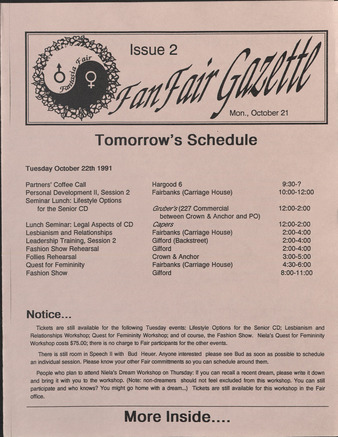 Collection: Fantasia Fair: Newsletters Institution: Schlesinger Library, Radcliffe Institute for Advanced Study, Harvard University Creator: The Outreach Institute of Gender Studies (OIGS) Date: Oct. 22, 1991 Topics: Crossdressing, Events, Gatherings, Logistics Subject: Fantasia Fair, National Transsexual Conference, New Woman Conference, Outreach Institute of Gender Studies (OIGS)