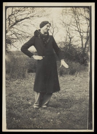 A man in drag poses on some grass, wearing a long thick coat. Photograph, 1934.