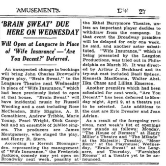 Collection: Newspaper and Periodical Clippings (1900-1949) Institution: Digital Transgender Archive Creator: Date: Mar. 29, 1934 Topics: Female impersonators Subject: Andrew Tribble, Are You Decent? (Play), Brain Sweat, Broadway, Longacre Theater, Wife Insurance Description: New York Times clipping announcing changes in theatre schedule, mentioning Andrew Tribble, a Black female impersonator. -